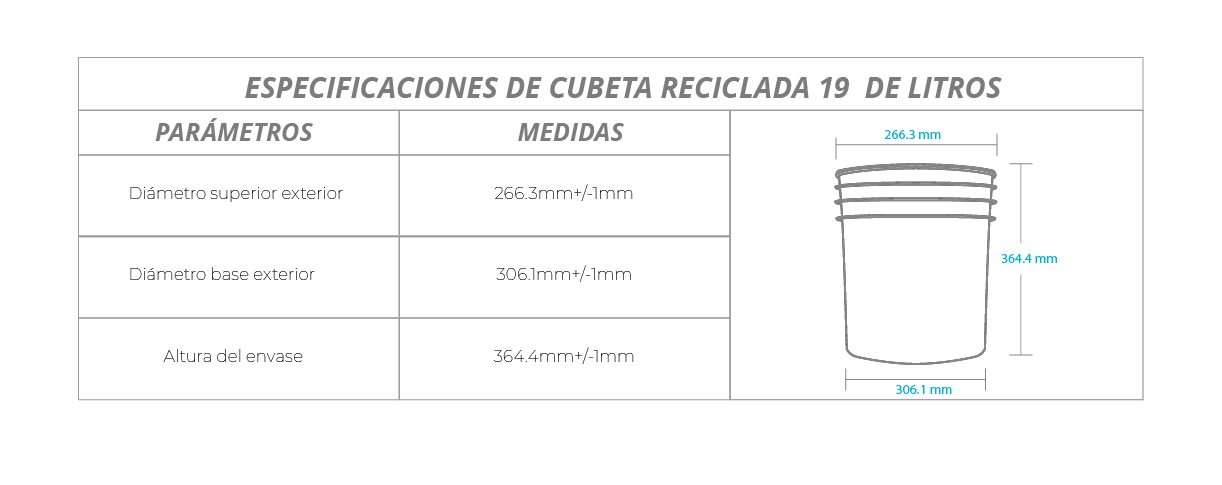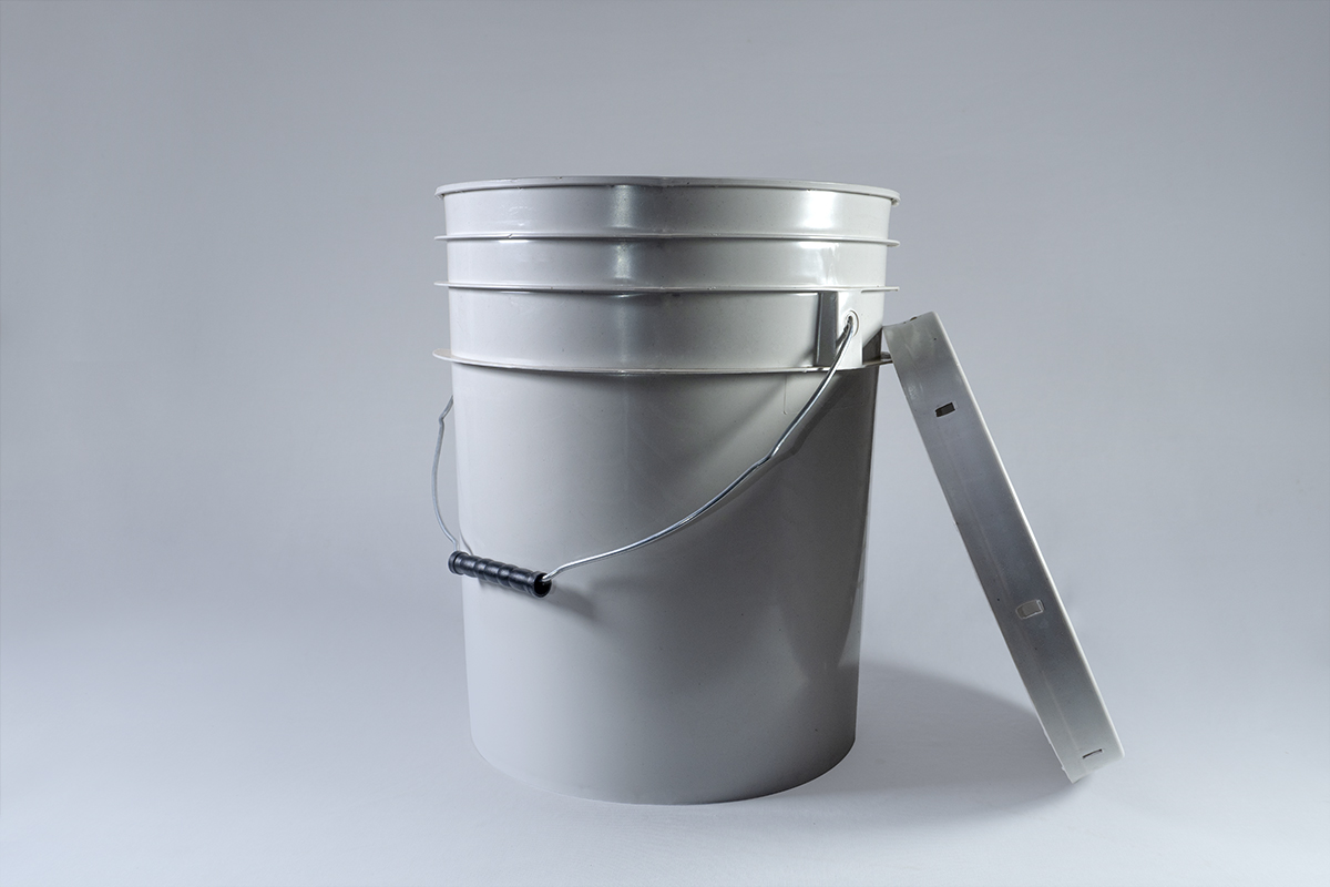 Con asa metálica. Elaborada con un porcentaje de material recuperado; por su tamaño es ideal para envasar grandes cantidades de pintura, manteca, aceites, etc. Recomendada solo para uso industrial.